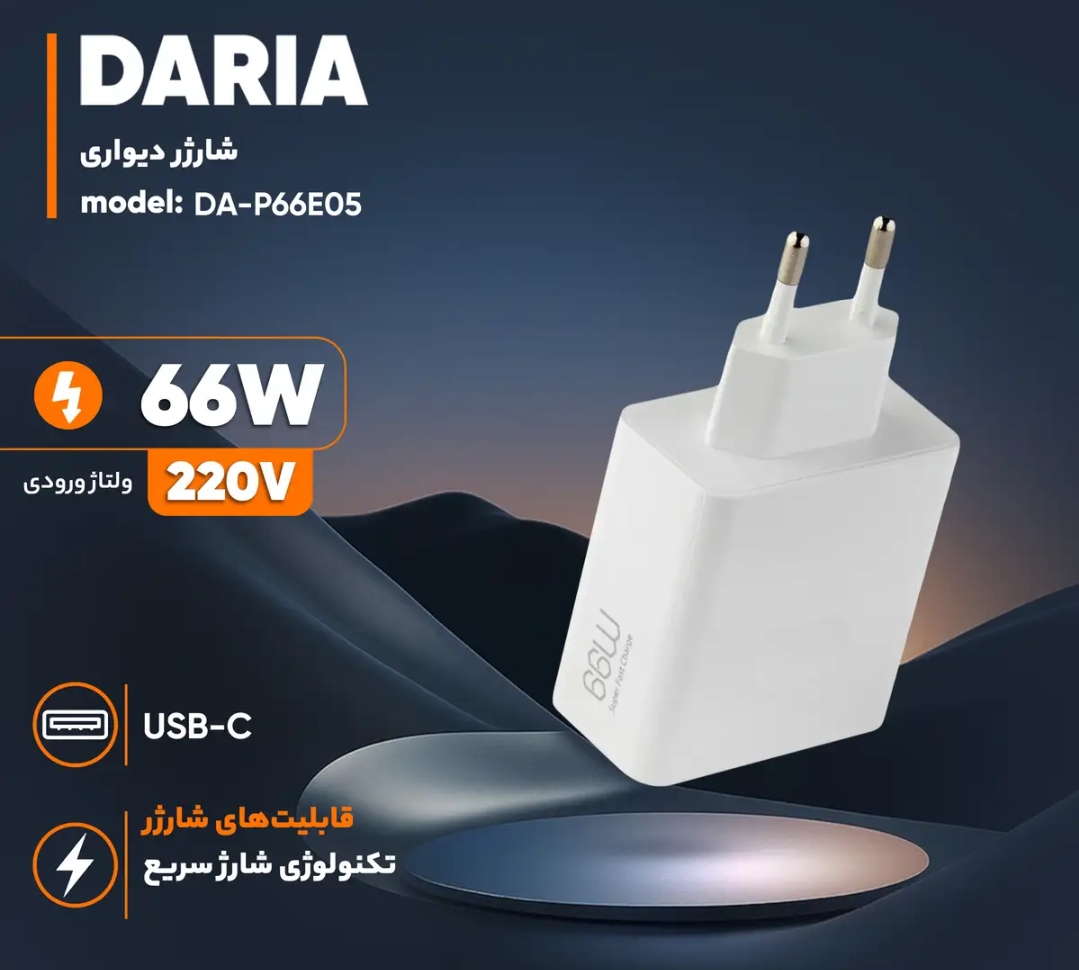شارژر 66w داریا مدل DA-P66E05 با گارانتی این محصول فقط برای گوشی های داریا نمی باشد و برای انواع گوشی هوشمند با قابلیت شارژ سریع می باشد